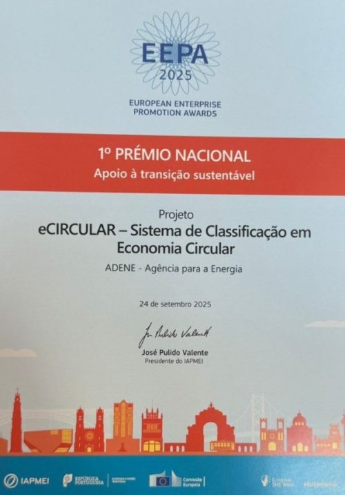 O projeto eCIRCULAR, promovido pela ADENE – Agência para a Energia, foi distinguido com o 1.º Prémio Nacional dos European Enterprise Promotion Awards (EEPA), iniciativa da Comissão Europeia que reconhece projetos e entidades que promovem o empreendedorismo e práticas de gestão sustentáveis.
